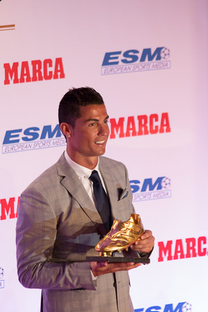 Fotografías tomadas el Martes 13 de Octubre en el Hotel Palace, Cristiano Ronaldo recibió la cuarta Bota de Oro de su carrera siendo el único jugador en tener cuatro trofeos. Florentino Pérez y el Presidente de Marca agradecieron el esfuerzo del jugador. Cristiano subió a su familia al estrado donde posaron con los cuatro trofeos, falto al evento la hermana de Cristiano. Photos taken the Tuesday 13th of October in Palace Hotel, where Cristiano Ronaldo received the fourth Golden Boot and becomes the unique player of the world that have got four awards. Florentino Pérez (President of Real Madrid) and the president of Marca (sport newspaper) gives thanks to Cristiano and greeting his efforts for the team. Cristiano request to his family to go up and pose whit the four Golden Boots, all the family was present whit the unique ausence of Cristiano sister .