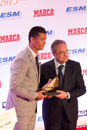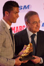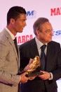Photos taken the Tuesday 13th of October in Palace Hotel, where Cristiano Ronaldo received the fourth Golden Boot and becomes the unique player of the world that have got four awards. Florentino Pérez (President of Real Madrid) and the president of Marca (sport newspaper) gives thanks to Cristiano and greeting his efforts for the team. Cristiano request to his family to go up and pose whit the four Golden Boots, all the family was present whit the unique ausence of Cristiano sister .