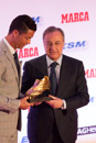 Fotografías tomadas el Martes 13 de Octubre en el Hotel Palace, Cristiano Ronaldo recibió la cuarta Bota de Oro de su carrera siendo el único jugador en tener cuatro trofeos. Florentino Pérez y el Presidente de Marca agradecieron el esfuerzo del jugador. Cristiano subió a su familia al estrado donde posaron con los cuatro trofeos, falto al evento la hermana de Cristiano.